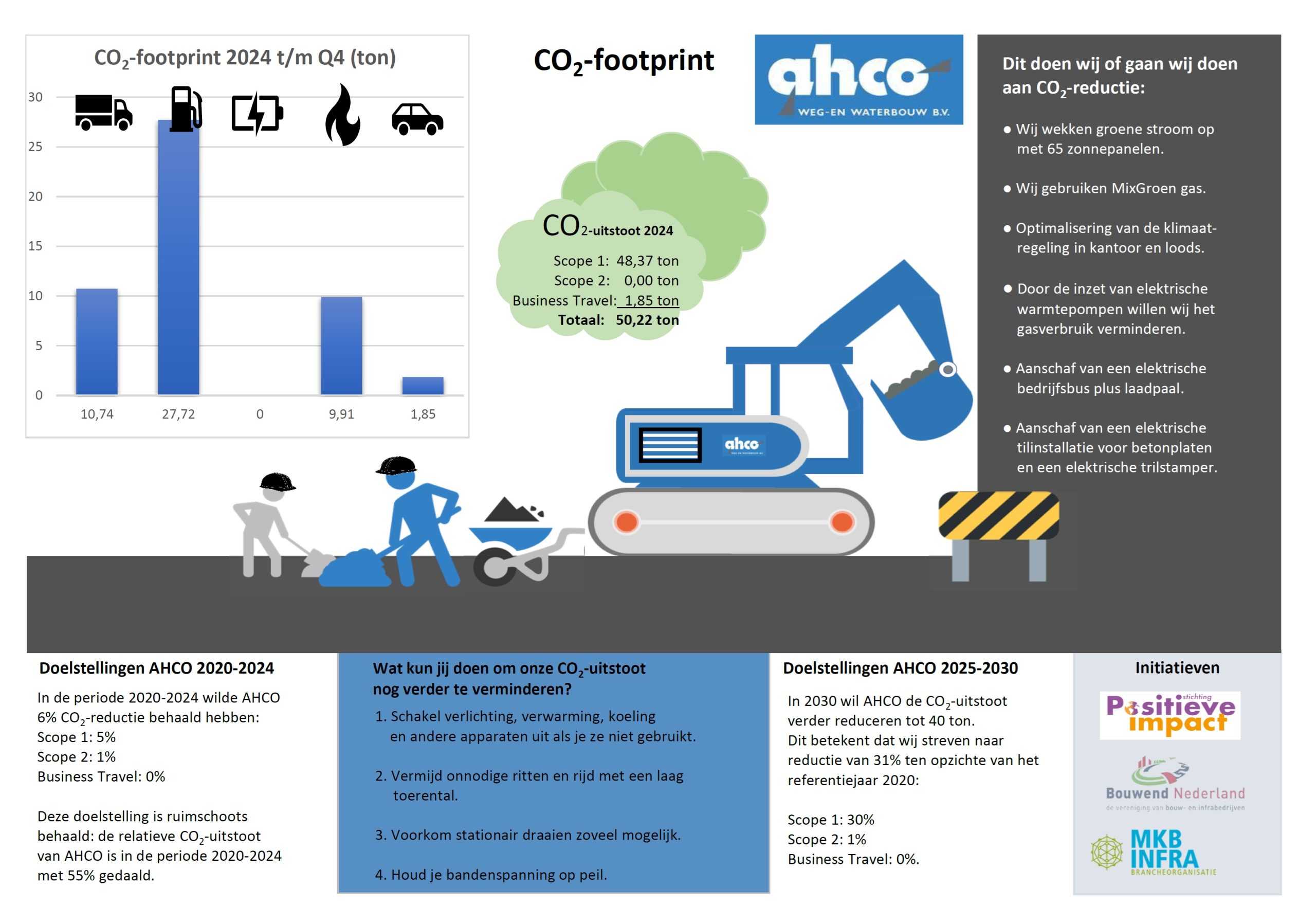 AHCO Weg- en Waterbouw B.V. wil in 2030 de CO₂-uitstoot hebben teruggebracht tot maximaal 40 ton.