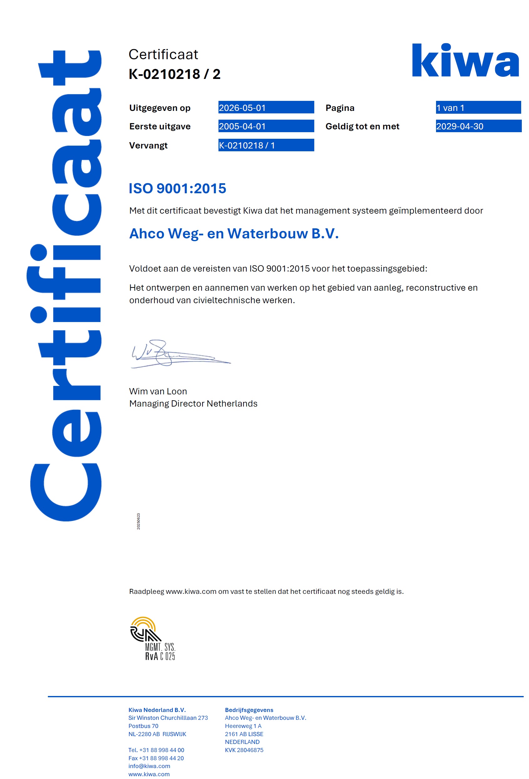 Om onze inzet voor kwaliteit aantoonbaar te maken laten wij onze bedrijfsprocessen regelmatig door onafhankelijke bureaus certificeren. AHCO Weg- en Waterbouw beschikt over de volgende certificaten: