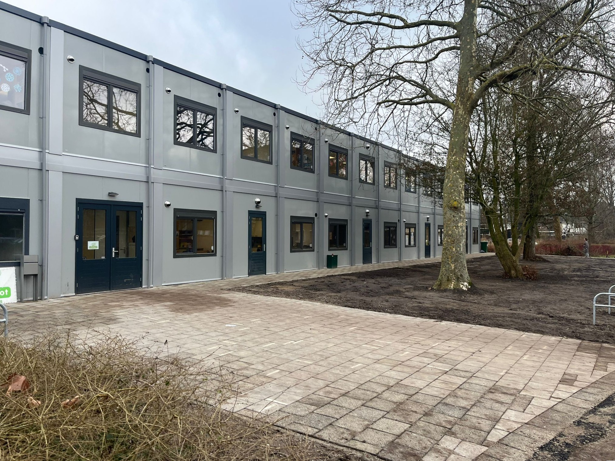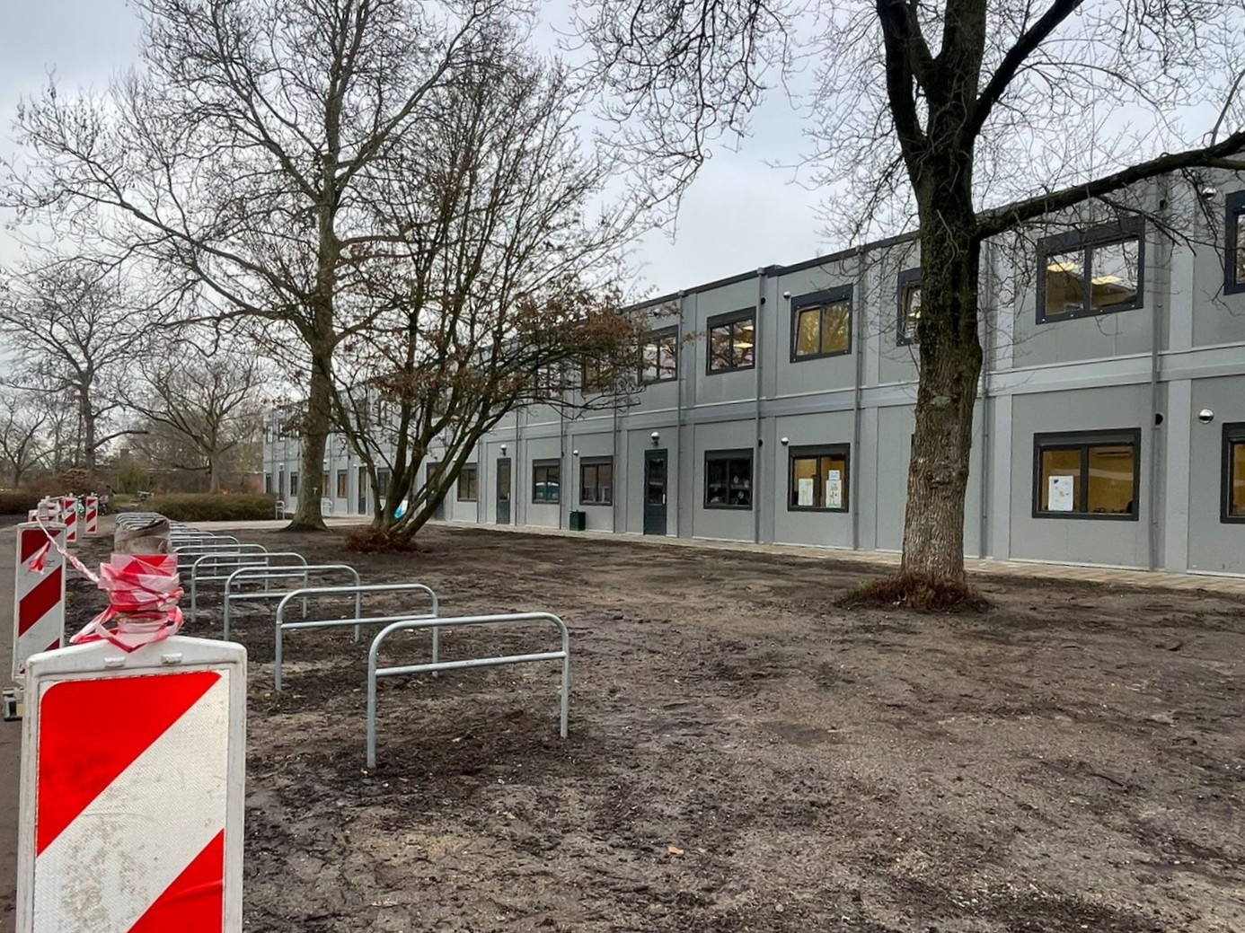 Grondwerk en terreininrichting voor een tijdelijk schoolgebouw